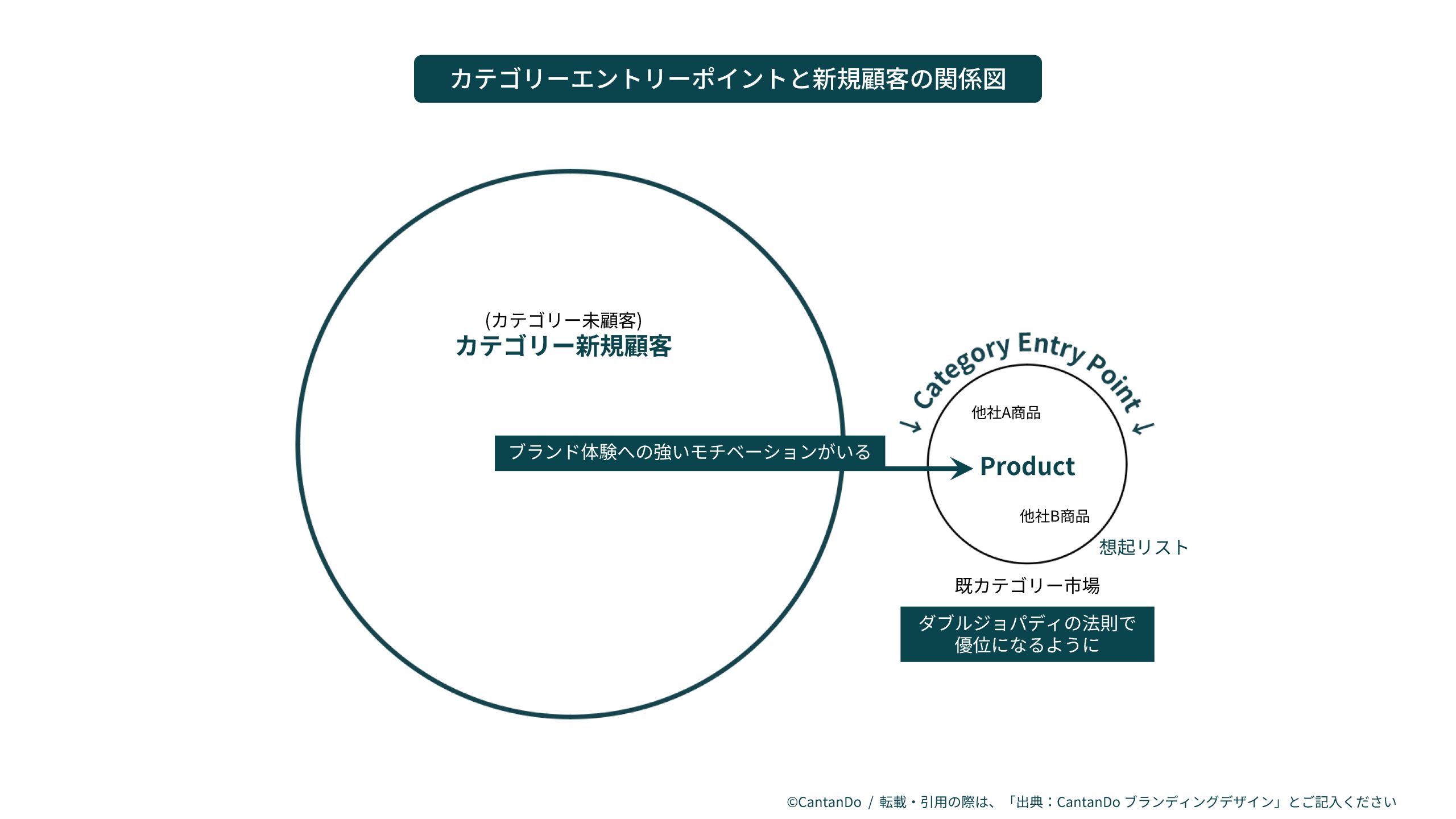 生活者が行動する際に想起する順番は、先に、いまの状況に対応(解決)できるカテゴリーはどんなものか?どのカテゴリーが適しているか?というように、カテゴリーの集合としての想起リストを持ちます。次に、想起したカテゴリー内で商品やブランドをどれにするか、という商品・ブランドの想起リストを持ちます。ですので、CEPの観点でブランディングを考える場合には、既カテゴリー顧客に対するアプローチとカテゴリー未顧客(新規顧客)へのアプローチの両方が必要になります。また、カテゴリー未顧客への対応は強いモチベーションを醸成するような大きな力を必要とします。