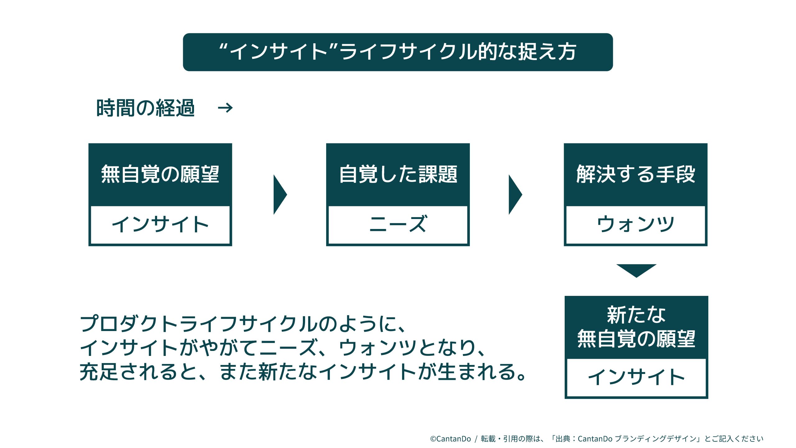 無自覚の願望であるインサイトが自覚され、課題目的としてニーズとなり、解決手段としてウォンツへとつながります。そして、元のインサイトであった願望が充足されることにより、また新たなインサイトが生まれてきます。このような一連の過程はプロダクトライフサイクルによく似ていますが、いわばインサイトライフサイクル的に捉えることができると思います。