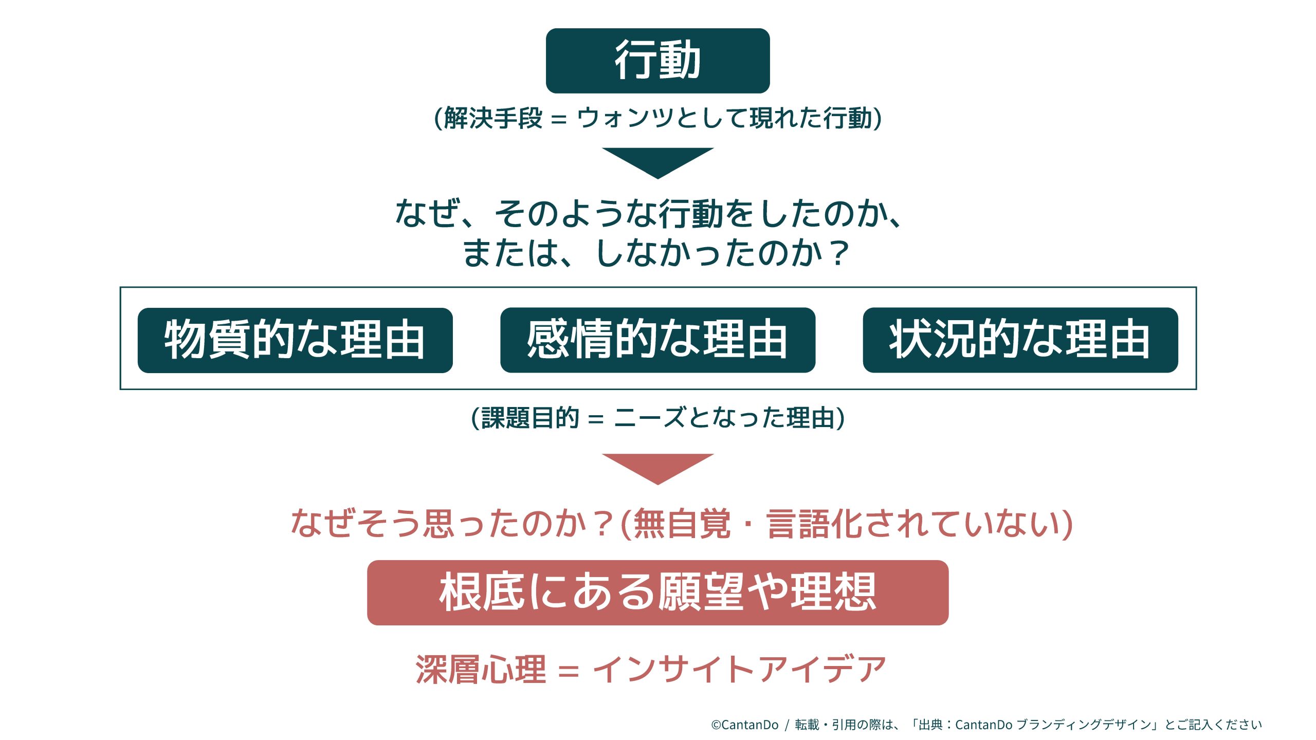 行動の理由となる3つの側面は生活者自身も自覚している課題目的/ニーズとして顕在化していますが、インサイトはそれよりも奥深くにある、生活者が自覚していない(言語化できていない)深層心理といえます。その課題目的/ニーズをつくりだしている願望や理想はどういうものなのか、深く掘り下げていき、ココロを動かしているものは何なのか、それによってどう気持ちが変化するのか、を言語化することがインサイトのアイデアを見つけていくことにつながります。