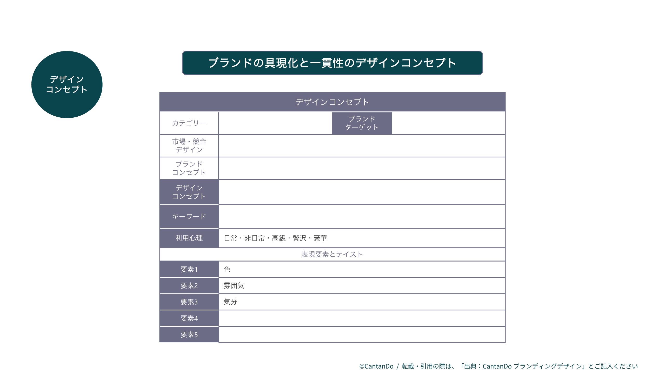 第5ステップは、「デザインコンセプト」です。前の第4ステップでできたコンセプト(文字/言葉)をビジュアルとして目に見えるかたちに具現化するプロセスでの指針となります。ここからがブランディングデザインの出口にあたるところであり、生活者・顧客が初めてブランドに触れる入口となるところになります。